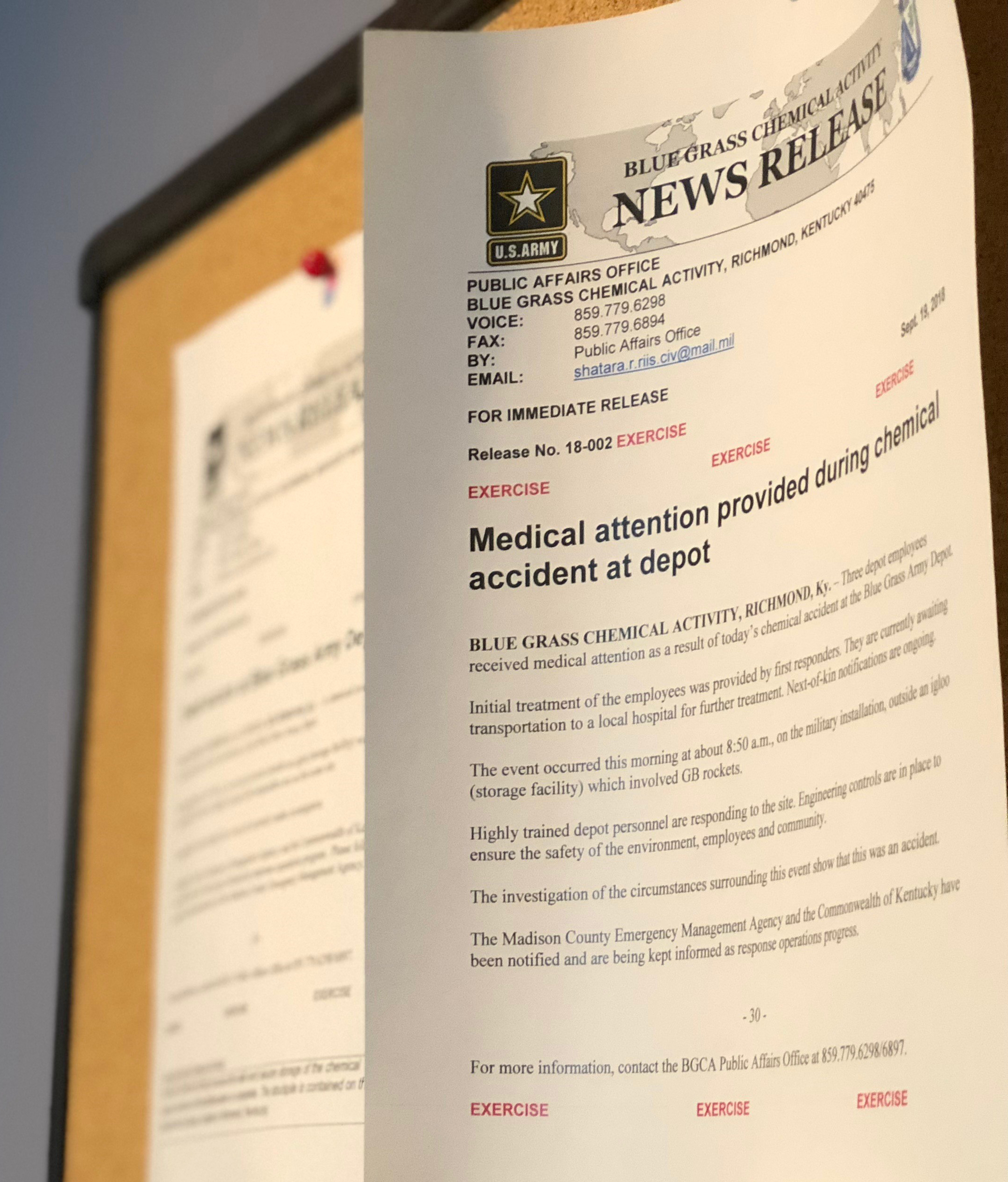 An exhibit at the U.S. Army Chemical Corps Museum at Fort Leonard Wood, Missouri, features the U.S. Army Chemical Materials Activity (CMA) role in chemical weapons history. The exhibit highlights CMA’s success in storing and destroying munitions at seven chemical stockpile sites, and its continuing mission to store the two remaining U.S. chemical stockpiles, protect communities surrounding the sites, assess and destroy recovered chemical warfare materiel, and comply with the Chemical Weapons Convention (CWC) treaty. CMA worked with leadership and subject matter experts to develop an exhibit that reflected CMA’s significant role in chemical weapons history.